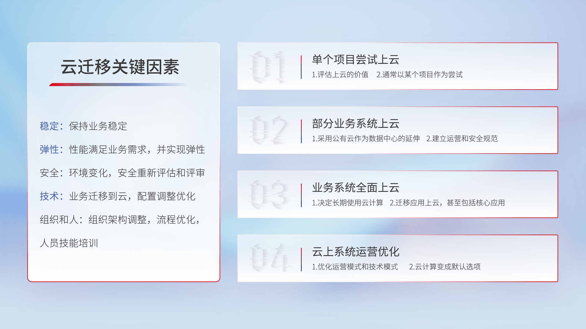 结合实际业务,,,,从规划设计、、、云平台选型、、、、云原生改造、、、数据迁移、、、集成交付,,,迁移全过程为客户识别最佳上云路径,,,做好风险识别管理,,设计网络架构、、、、身份权限、、、、安全审计合规、、操作审计、、、、日志审计、、监控告警策略、、多站点容灾设计等,,,对云上基础设施进行整体规划,,,提升IT治理水平,,,以满足弹性、、、、高可用、、、、高性能的需求。。