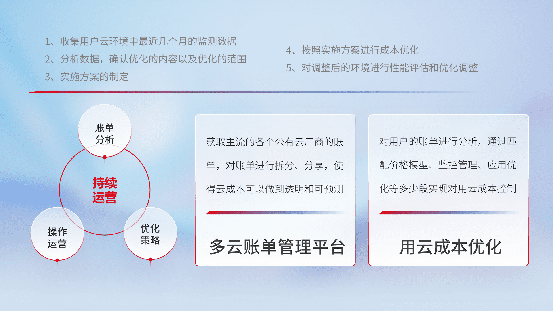 通过多云纳管,,,,以统一的资源数据模型把客户的云资源进行抽象和封装,,,,进而实现对多云资源的统一操作,,,保障云资源管理的可靠性、、、稳定性与可用性。。。。量身定制化运维内容,,配置、、开发运维、、补丁管理、、备份、、、监控、、认证和访问管理、、、审计和日常巡检等,,,保障在用云过程中的可靠度,,,,稳定度以及高可用率。。。