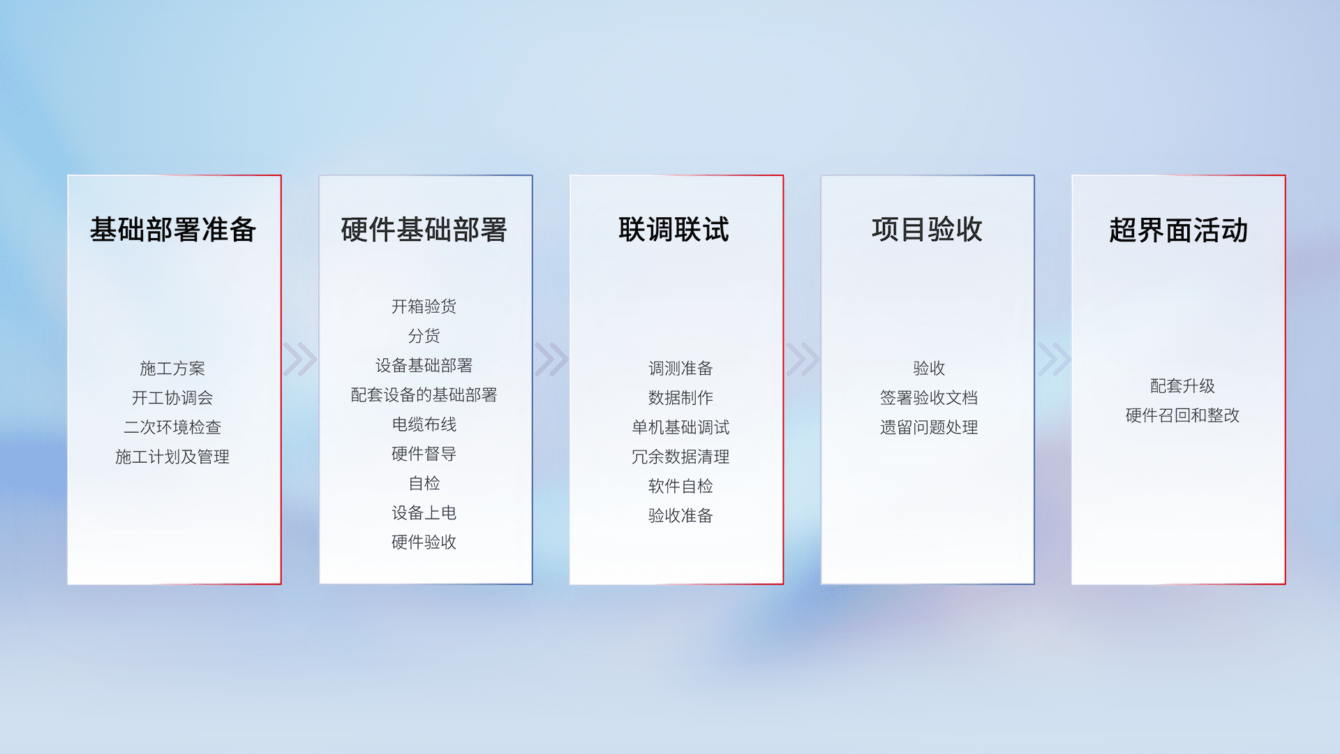 从基础部署准备、、硬件基础部署、、联调联试、、项目验收、、越界面活动的全过程可追溯,,保证施工质量和进度。。。